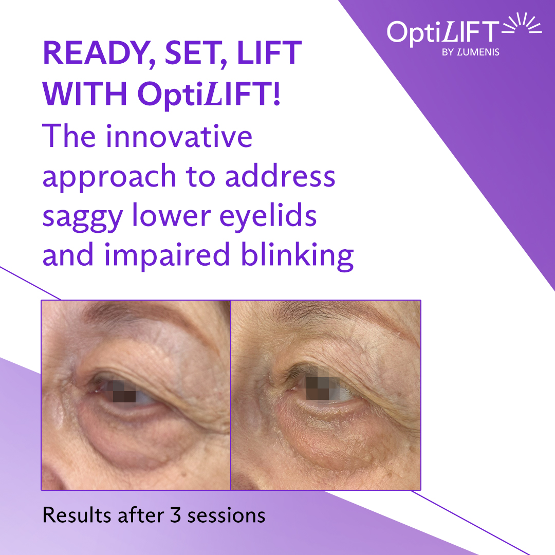 OptiLIFT by Lumenis is a gentle, non-surgical treatment designed to improve both eye comfort and the appearance of the lower eyelids. As we age, the muscles around the eyes can weaken, leading to droopy lids, incomplete blinking, and dry eye symptoms. OptiLIFT uses Dynamic Muscle Stimulation (DMSt) to activate and strengthen these muscles, helping improve blinking quality, tear stability, and meibomian gland function. Clinical studies show significant improvements in tear breakup time, blinking efficiency, and lower lid tone – often in just four comfortable, in-office sessions. The result is better eye comfort, healthier tear function, and a refreshed, more lifted appearance with no downtime.