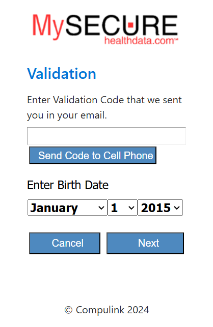 A validation code will be sent to your email address. Enter that code and your birthday. Select Next.